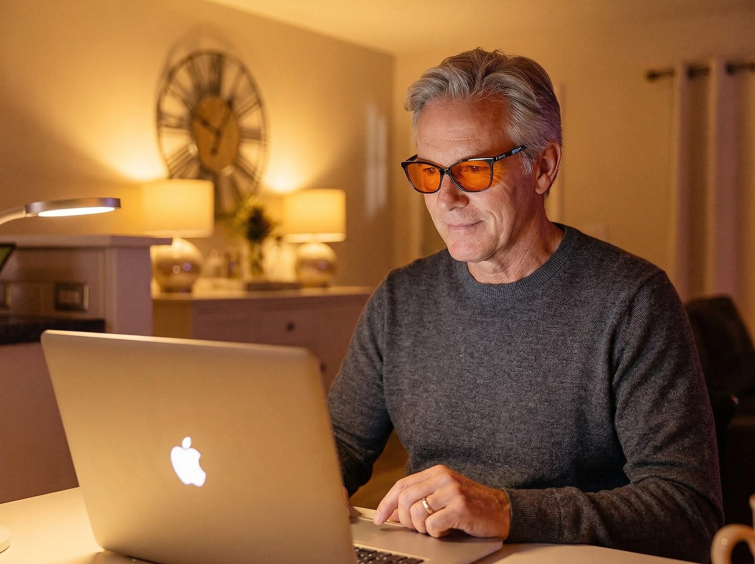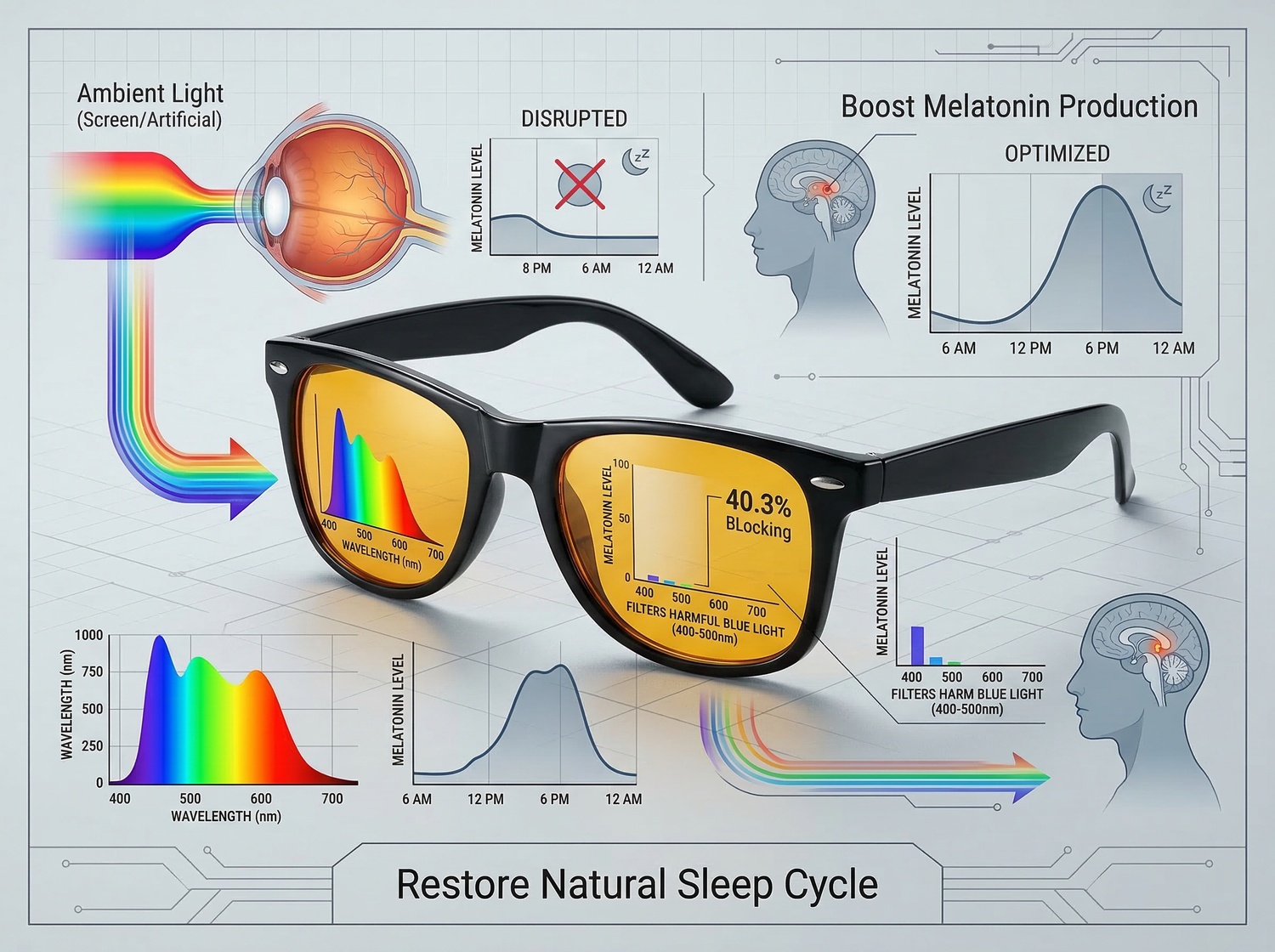 Blue light from screens and LED lights disrupts your circadian rhythm by suppressing melatonin production—the hormone that signals your body it's time to sleep. Our orange-lens glasses block 99% of blue light (380nm-500nm), allowing your brain to naturally produce melatonin in the evening. Wear them 2-3 hours before bedtime while using devices, and experience faster sleep onset, deeper sleep cycles, and wake up feeling truly refreshed.